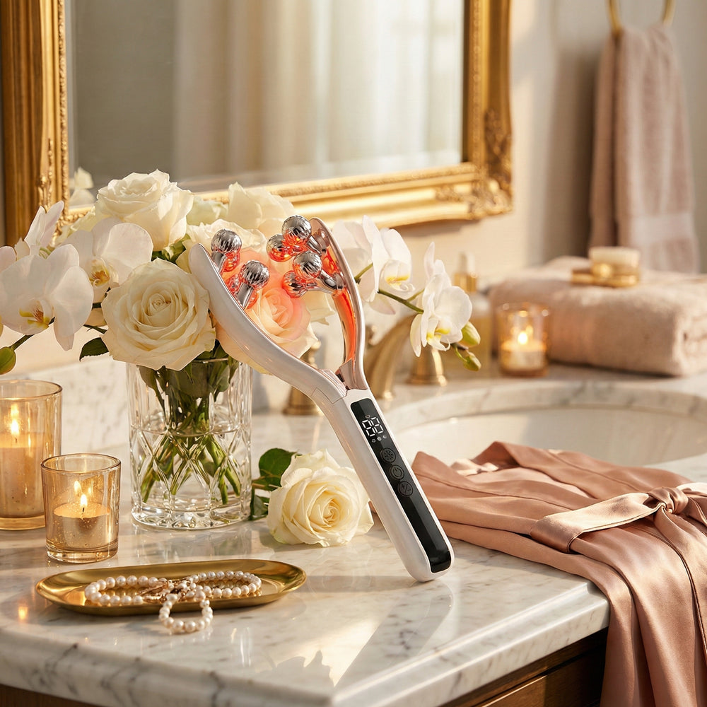 The Auréa Sculptor combines soothing massage with red light therapy to help reduce puffiness, support circulation, and promote a firmer, more sculpted appearance.